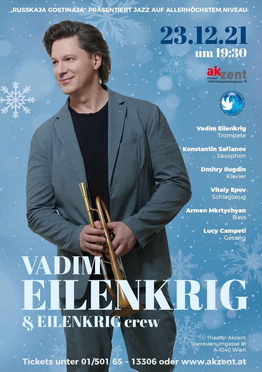 Vadim Eilenkrig war zehn Jahre lang Solist im wichtigsten Jazzorchester Russlands. Einst bezeichnete man ihn als «russischen Chris Botti», heute ist Vadim Eilenkrig russischer Trompeter № 1, Moderator des Fernsehsenders “Russland-Kultur” und Produzent. Seine virtuose Beherrschung des Instruments und seine außergewöhnliche persönliche Ausstrahlung machen Vadim zu einem ungewöhnlich gefragten und beliebten Jazzman auf russischen und europäischen Musikbühnen (Gewinner des Musician of the Year Award laut Radio Jazz 89.1). Sein Album “Eilenkrig” belegte den 4. Platz in den russischen iTunes (Top 200 Jazz Chart) und den 1. Platz in Armenien (Top 200 Tracks Armenia All Genre Chart).